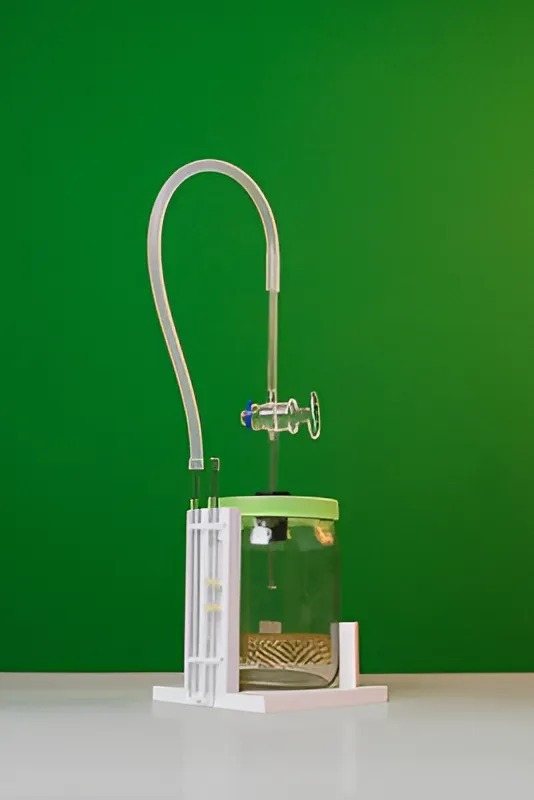 Прибор состоит из стеклянного сосуда, установленного на основании с U-образным манометром, снабженным указателями уровня. Сосуд разделен сеткой на две части. В крышку сосуда вставляется резиновая пробка с зажимом (краном) и трубкой. Свободный конец трубки подсоединяется к манометру. Для заполнения манометра подкрашенной жидкостью к прибору прилагается шприц с иголкой, закрытой колпачком.