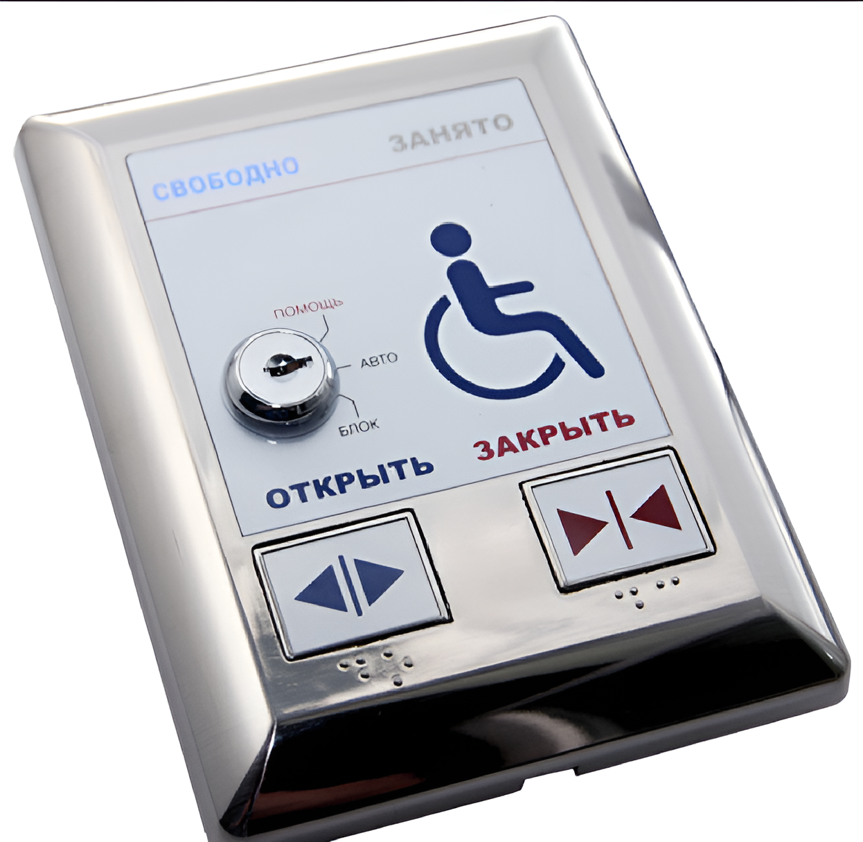 Панель русифицированная с голосовым сопровождением для открывателей дверей для санитарных комнат и душевых и блок управления. Панель обладает возможностью открыть и закрыть дверь посредством нажатия на соответствующую кнопку, возможностью запереть дверь изнутри помещения, а также индикацией «занято/свободно».