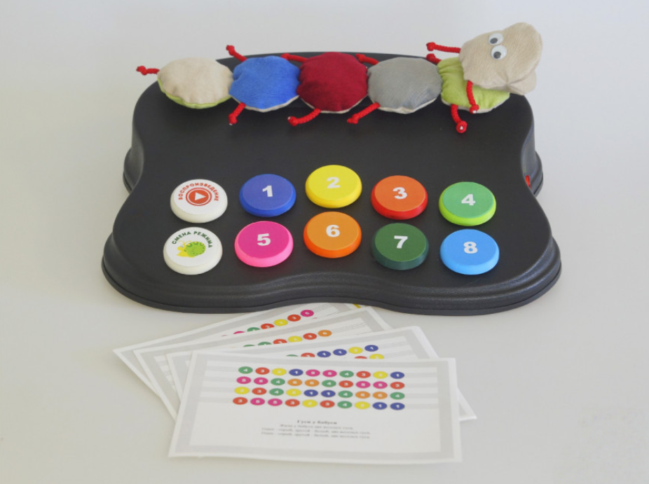 В комплекте с улиткой 6 карточек, на которых цветными кружочками записаны ноты песен. Цвет кружочка-ноты соответствует кнопке того же цвета на игрушке.