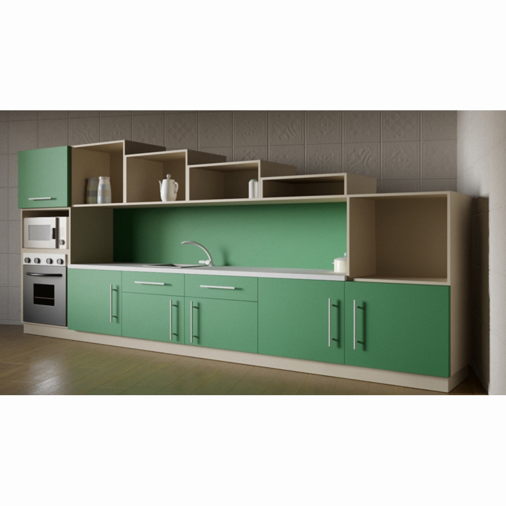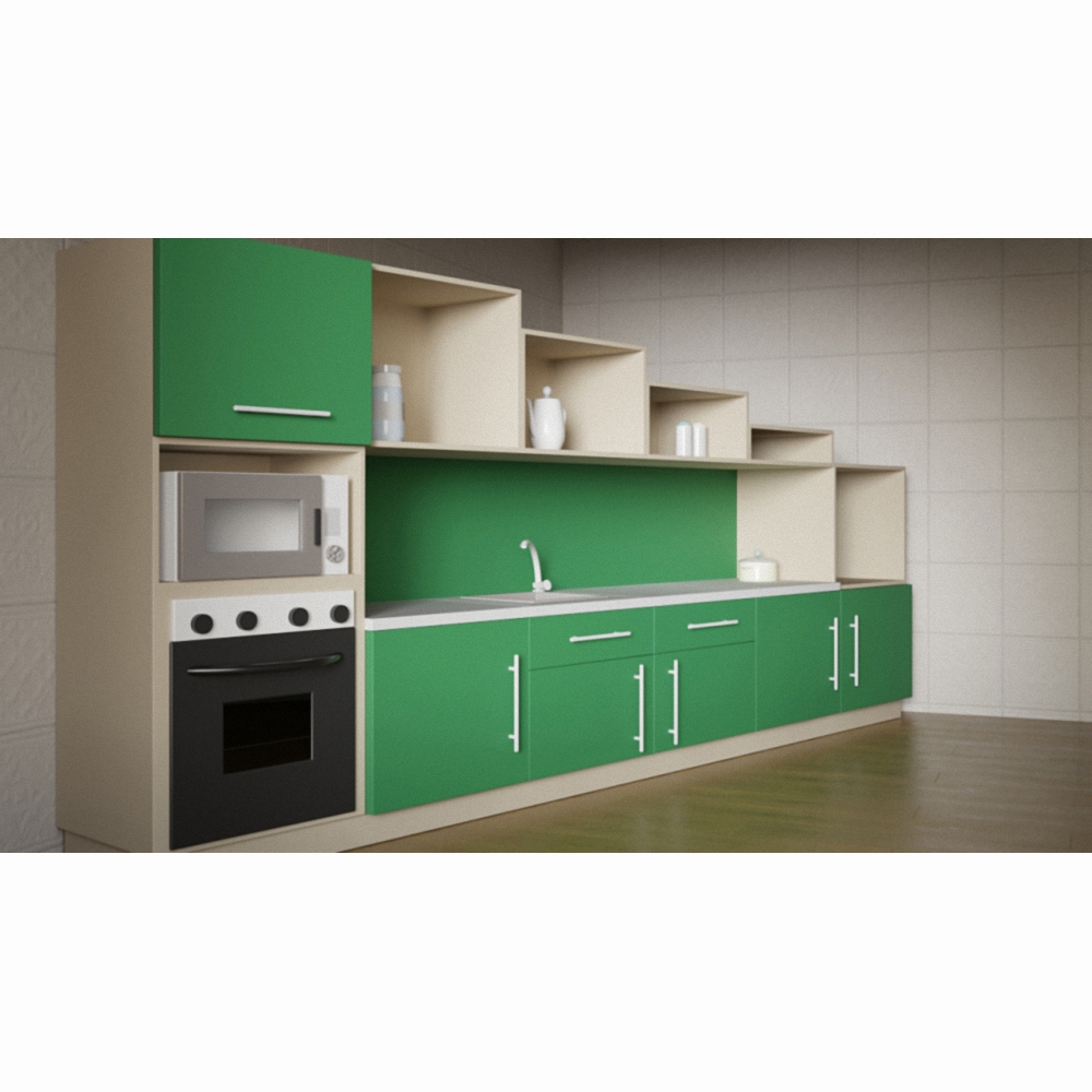 Верхний ярус кухни имеет красивую форму исполнения, которая, вне всяких сомнений, привлечет детское любопытство. Фасады окрашены в зелено-коричневоц сдержанной гамме, оттенены отдельными элементами белоснежного цвета. Вся детская кухня изготовлена из экологически чистых материалов высокого качества.