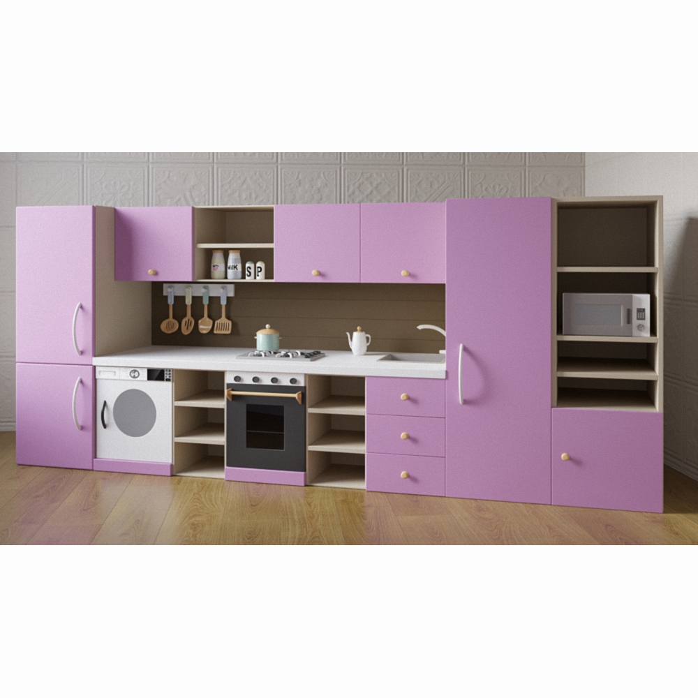Кухня «Лаванда» оснащена всем, что можно встретить на настоящей взрослой кухне – бытовая техника, столешницы, полочки, шкафчики и ящички. Фасад изготовлен из высококачественного материала и окрашен в оттенок лаванды с минималистичными акцентами белого цвета.
