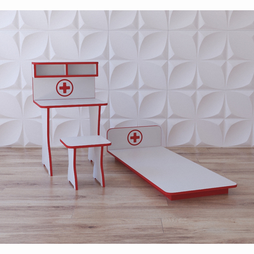 Игровое оборудование для игры в доктора предназначено для детей от 1 года. Лаконичное исполнение делает его незаменимым для весёлых сюжетных детских игр. Особенно такой домик оценят по достоинству ребята, которые мечтают стать медицинскими в будущем. Игровое оборудование для игры в доктора включает в состав столик с полочками, стул и кушетку, все предметы окрашены в бело-красные цвета. Игра станет ещё более наполненной, если комплект домику составит игровой модуль из нашего каталога, который называется детский игровой домик “Поликлиника”.