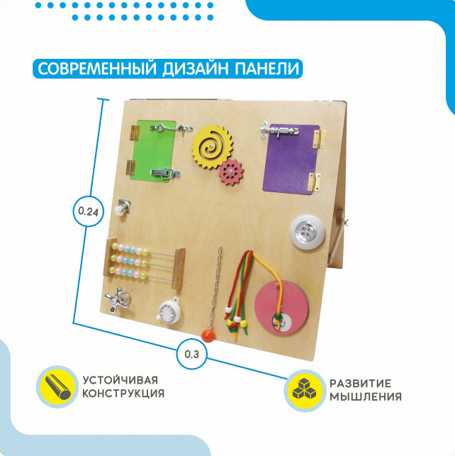 Бизиборд №1 обладает всем необходимым для разностороннего развития ребенка. Удобные дверцы с защелками и шестеренки позволяют развивать мелкую моторику и учить малышей считать. Бусины на шнурках тренируют пальцы и помогают осваивать навыки сопоставления цветов. Все эти элементы не только увлекательны, но и безопасны для малышей благодаря возможности надежного крепления к стене.