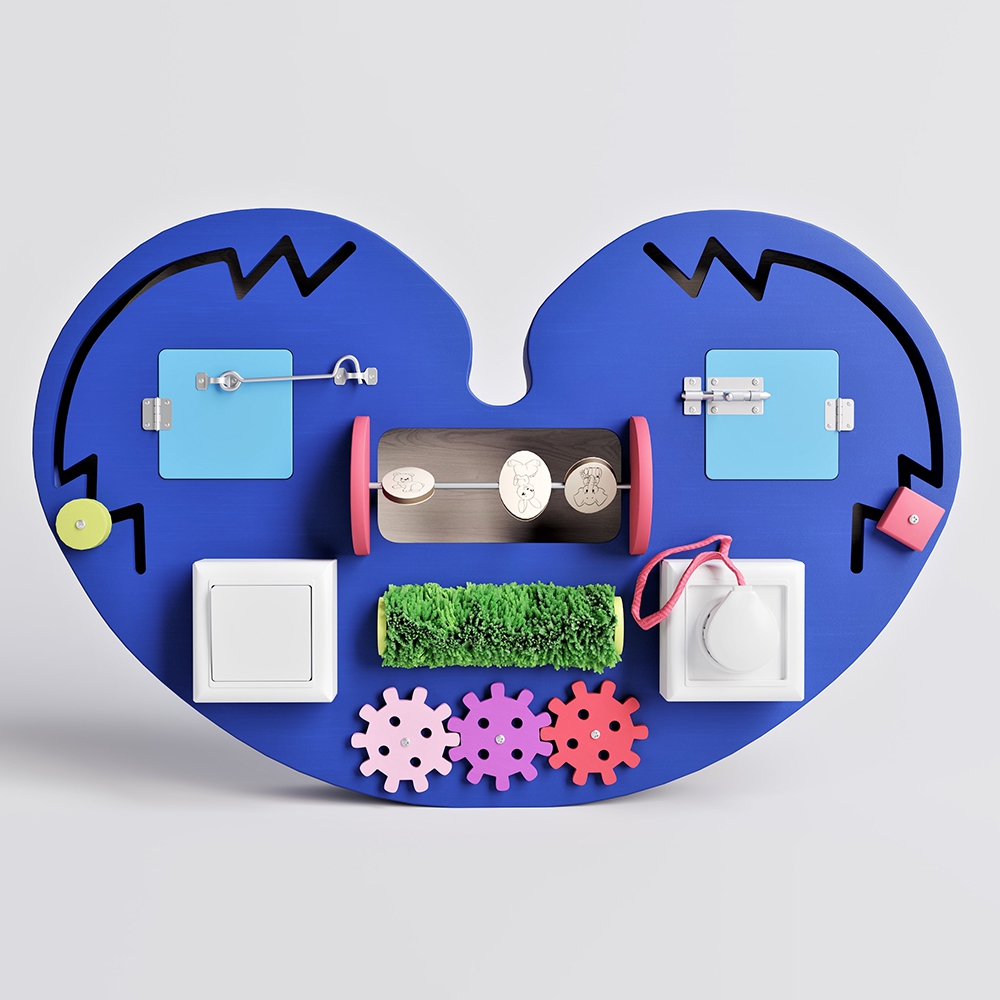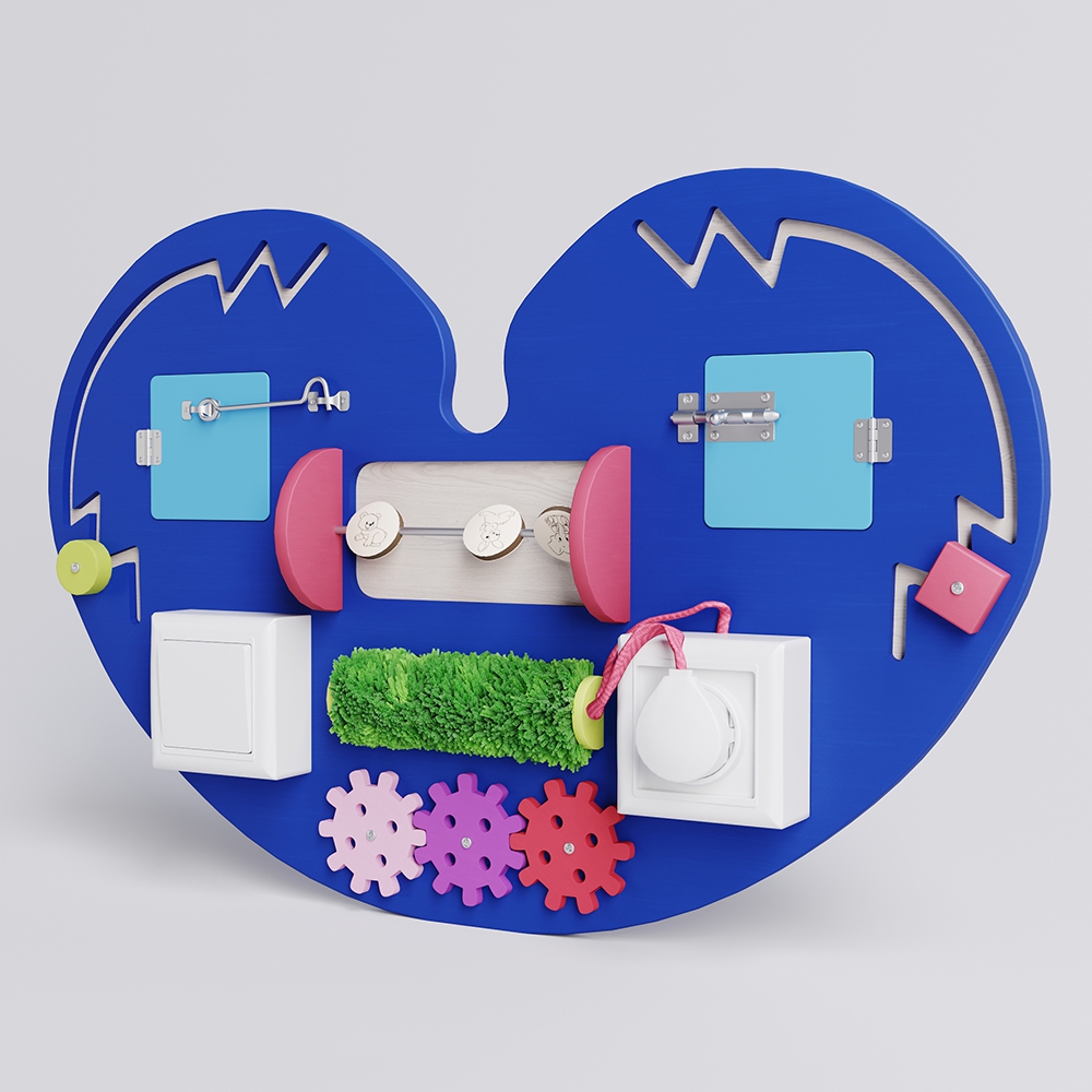 У человека центры, отвечающие за речь и движения пальцев рук находятся близко друг к другу, стимулируя моторику, активизируя соседние зоны, отвечающие за речь. Очень важно начать тренировку пальцев малыша с раннего детства, это гибкий подход и ребенок быстрее сам научится всему. Бизиборд в виде большого сердца синего цвета успокаивает и поможет снять напряжение.