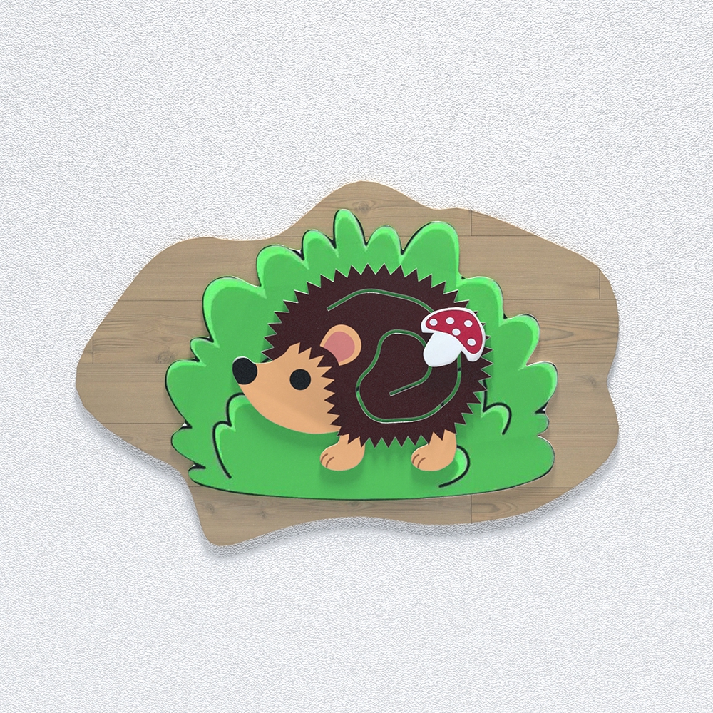 Бизиборд – дидактическое приспособление с игровым уклоном для детей от 1 года. Может быть как объёмным (куб, домик), так и более компактным - в виде плоской настенной панели, которая замечательно экономит игровое пространство, не уменьшая при этом его ценности. Бизиборд в виде ежика - одна из таких моделей, которая крепится к стене. Основа имеет форму кустика, на фоне которого прикреплён ёжик с грибочком на иголках. Поверхность игрушки отполирована специальным образом по особо технологии и покрыта несколькими слоями (грунт, лак, краска) экологически безопасных материалов.