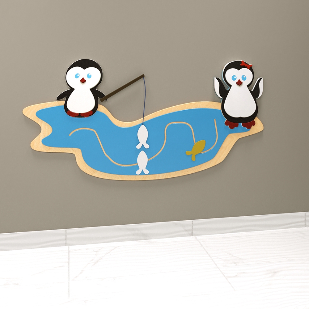 Бизиборд – дидактическое приспособление с игровым уклоном для детей от 1 года. Может быть как объёмным (куб, домик), так и более компактным - в виде плоской настенной панели, которая замечательно экономит игровое пространство, не уменьшая при этом его ценности. Бизиборд в виде пингвинов с удочками - одна из таких моделей, которая крепится к стене. Украшена фигурками пингвинчиков (мальчика и девочки) и рыбок.