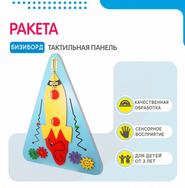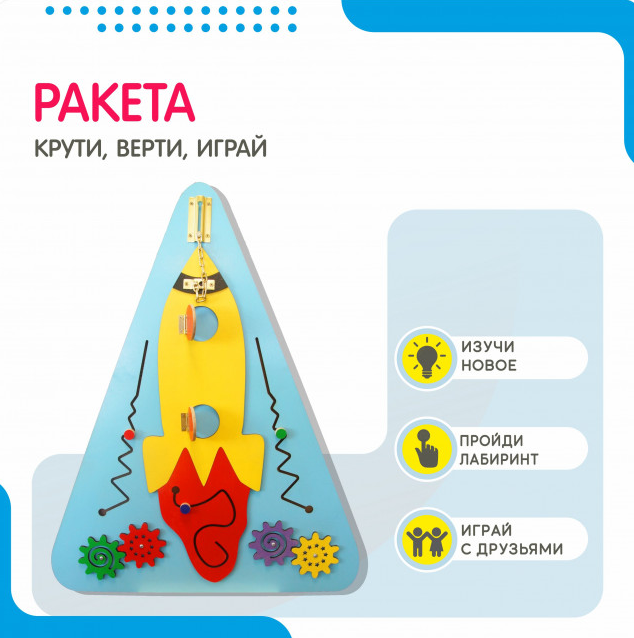 • Логическое мышление и пространственная ориентация. Фигура ракеты и разнообразные элементы на Бизиборде в виде ракеты помогают развить логическое мышление и воображение. Ребенок будет учиться устанавливать связи между разными элементами и ориентироваться в пространстве.