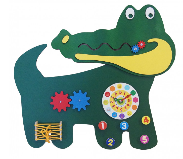 Бизиборд в виде зеленого крокодильчика прекрасно подойдет для занятий с детьми в дошкольный учреждениях, школах, а также детских центрах, радуя детей изо дня в день, как в большой компании, так и в одиночестве.