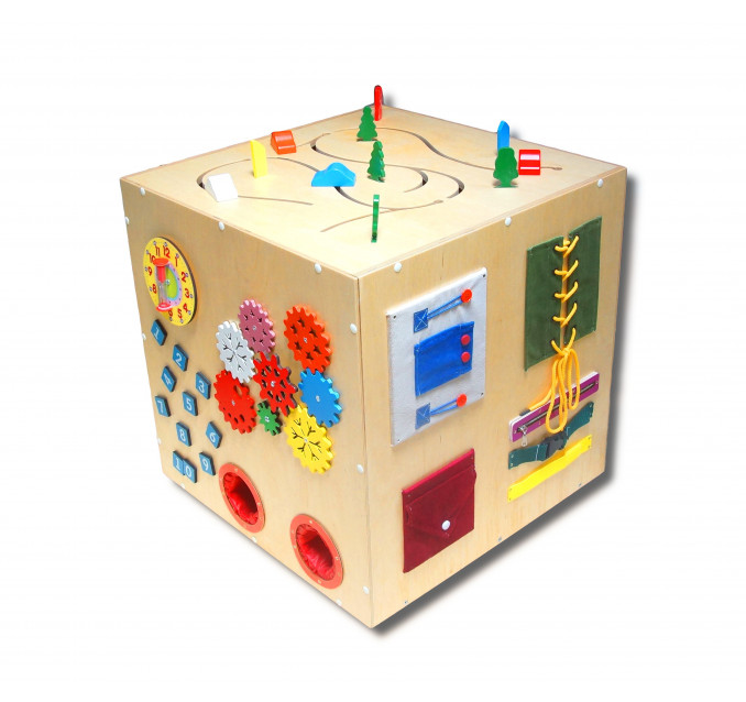Бизикуб - это развивающее оборудование, заменяющее 5 отдельных бизибордов и предназначенное для детей от 3-х лет. Изготовленный из натуральной древесины, он компактный и мобильный, позволяя ребенку развиваться и играть в любом месте. Шестеренки, шнуровка, часы, крутящиеся элементы, цифры, тактильные ячейки, руль, счеты, одежные застежки и тактильные лабиринты - всем этим оснащен наш Бизикуб №1, и все это помогает развивать моторику и логическое мышление ребенка.