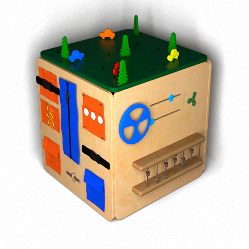 • Бизикуб повторяет элементарные навыки в повседневной жизни: зашнуровать ботинки, застегнуть или расстегнуть кофточку, открыть или закрыть дверь. Таким образом, малыш становится самостоятельным.