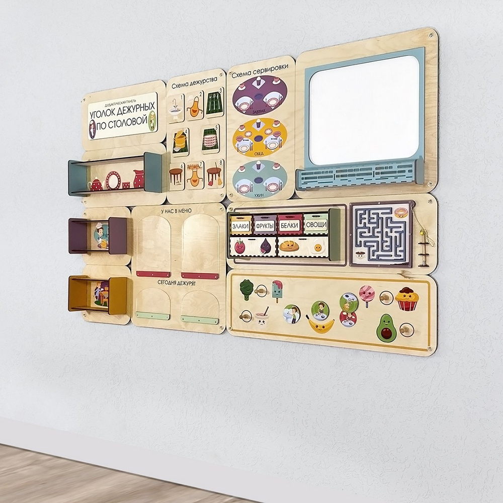 Главная Каталог Оборудование для детского сада Сенсомоторное развитие Сенсорные панели для детей «Уголок дежурных по столовой» - Дидактическая настенная панель