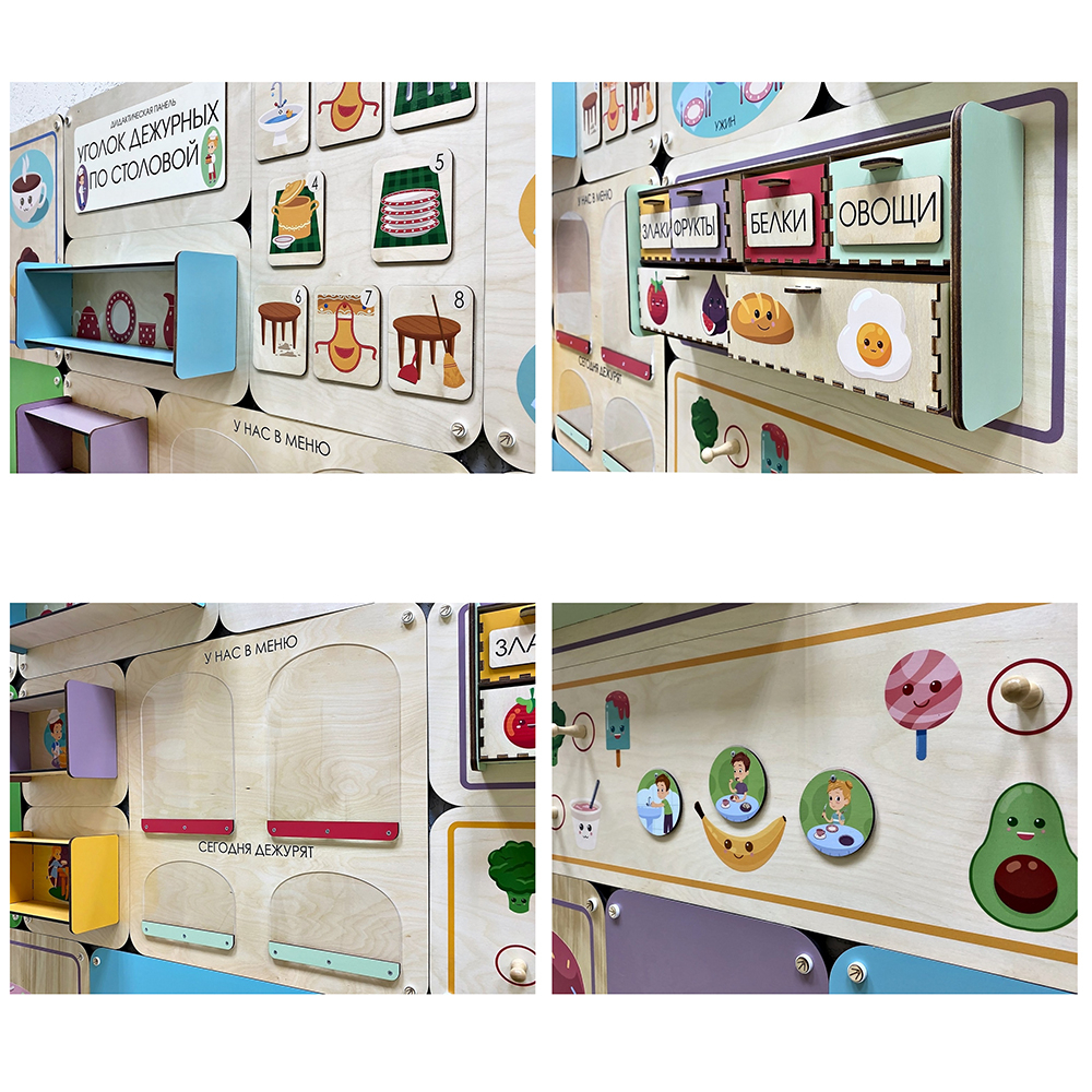 Каждый модуль панели нацелен познакомить детей с меню питания, графиком дежурств, полезными продуктами, правильным поведением за столом.