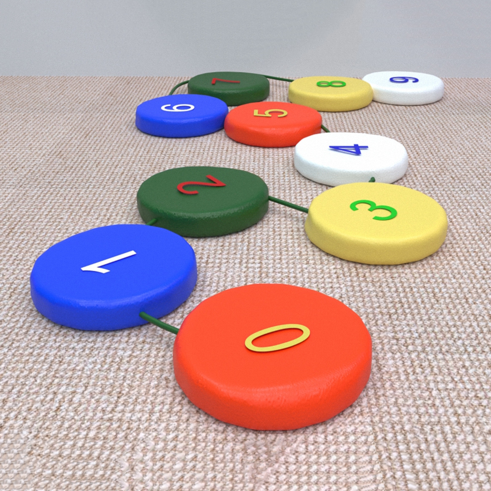 Представленный игровой набор – это мягкий бескаркасный модуль, область использования которого – спортивные и обучающие занятия. Внешне представляет из себя набор мягких поролоновых дисков одинакового диаметра и толщины, который оформлен в едином стиле (на разноцветных монохромных дисках в качестве аппликации изображены цифры по порядку от 0 до 9). Диски соединены между собой верёвочкой; из-за этого дорожка чем-то напоминает координационные тропы, так как с ней можно выполнять некоторые аналогичные упражнения - можно просто ходить, обучаясь соблюдению равновесия и тренируясь сохранять правильную осанку, или перепрыгивать её поперёк, использовать дорожку в качестве своеобразного рубежа, через который нужно перекинуть предмет (мячик, грузик - мешочек с наполнителем) – широта диапазона использования зависит от фантазии педагога; кроме этого, игровой набор «Цифры-шагайка» позволяет выучить с дошкольником цифры и научиться порядковому и обратному счёту в непринуждённой игровой форме. Несомненные плюсы этой дорожки – отсутствие твёрдого, жёсткого каркаса и наличие мягкого, упругого наполнителя, ведь это гарантирует безопасность в использовании. Не требует сложных условий в уходе.