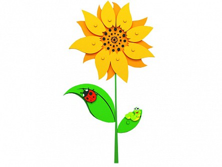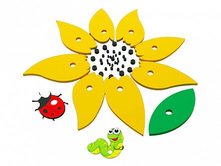 Панель представляет собой сборную конструкцию из влагостойкой фанеры. Основной элемент изделия: вертикальное настенное декоративное панно. Функционально-игровое поле панно стилизовано в виде цветка подсолнуха c креплениями для сменных игровых элементов. Сменные игровые элементы выполнены в виде семечек и лепестков подсолнуха и снабжены ответной частью крепления. Конструкция креплений предусматривает смену и фиксацию игровых элементов с приложением небольшого усилия. Панель монтируется на внутреннюю стену помещений при помощи навесных креплений.