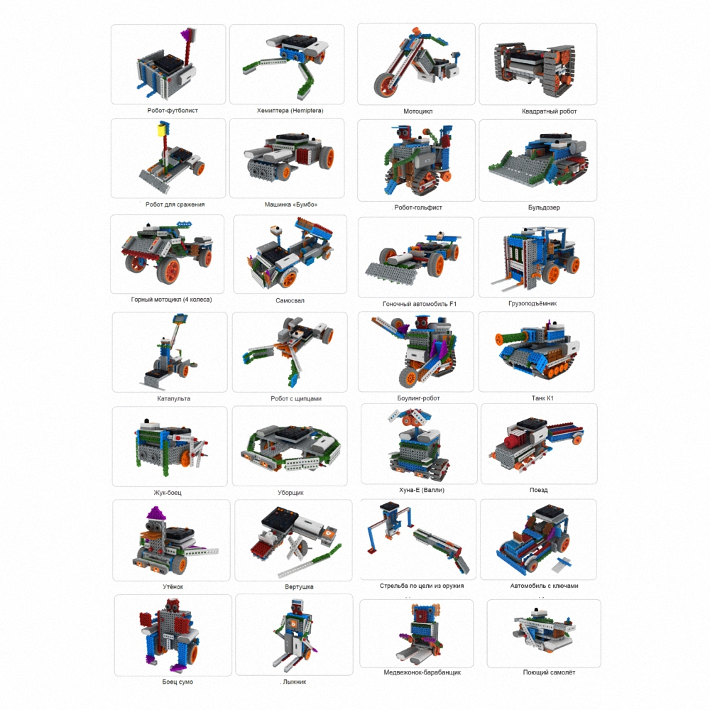 Из конструктора можно собрать это более 100 моделей. По предложенной инструкции можно собрать: Гоночный миниавтомобиль, Вертолёт «Аватар», Дон-Кихота, Х-футболиста, Медвежонок-барабанщика, Поющий самолёт, Бампер-автомобиль, Робота-коробку, Робот-бойца, Мини-танк, Утёнка, Вертушку, Бойца cумо, Лыжника, Валли, Поезд, Стенд для стрельбы по цели из оружия, Автомобиль с ключами, Робот-футболиста, Хемиптера (Hemiptera), Робота для сражения, Машинку «Бумбо», Робота для ограждения, Катапульту, Робота с щипцами, Жука-бойца, Уборщика, Самосвал, Мотоцикл, Квадратного робота на гусеницах (вездеход), Робота-гольфиста, Бульдозер, Горный мотоцикл (4 колеса), Гоночный автомобиль F1, Грузоподъёмник, Боулинг-робота, Танк К1.