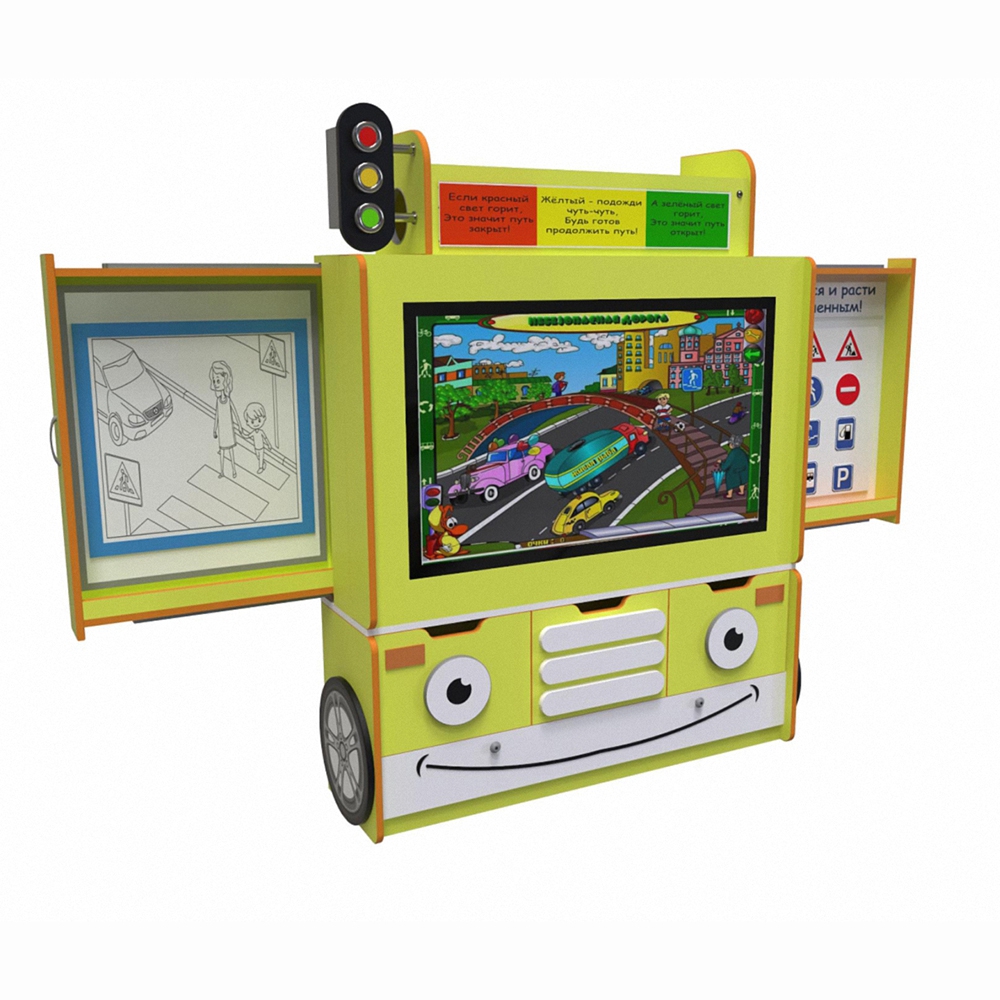 Представленный в виде автобуса, он поможет детям усвоить правила дорожного движения и главные знаки в развлекательной форме. В этом поспособствует 340 приложений. Программное обеспечение характеризуется интуитивно понятным интерфейсом и графическим материалом, который позволяет ребенку понять наглядно представленную информацию.