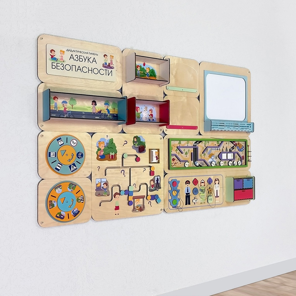 - Занятия с панелью «Азбука безопасности» помогут ребёнку освоить жизненно важные навыки поведения. Дети формируют представления о правилах безопасности дома и в общественных местах, учатся строить причинно-следственные связи, развивают логическое мышление, мелкую моторику, цветовосприятие.