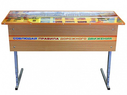 Комплект представляет собой набор из двухместного стола и двух стульев. На столешнице стола размещено поликарбонат, под которым изображены дорожные ситуации с комментариями из правил дорожного движения, дорожная разметка, дорожные знаки и светофоры.
