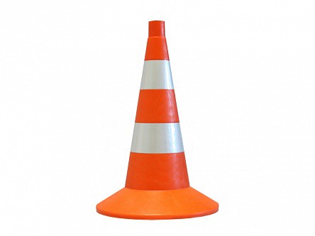 Сигнальный дорожный конус представляет собой техническое средство организации дорожного движения в форме конуса оранжевого цвета с площадкой у основания и двумя световозвращающими полосами.