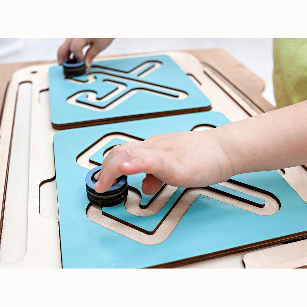Это нейроигрушка для развития межполушарного взаимодействия. Состоит из коробки-основания и цветных лабиринтов-вкладышей. Два лабиринта с зеркально изображёнными картинками устанавливаются в пазы, и ребёнок проходит их с помощью специальных пальчиковых фишек.