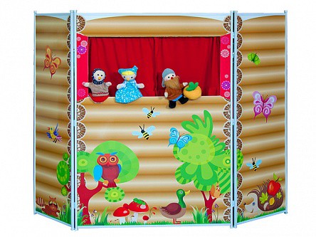 Напольная ширма представляет собой складную переносную конструкцию, состоящую из трех секций. Лицевая панель выполнена в форме домика, имеет большое окошко с занавесками, являющееся главной сценой спектакля.