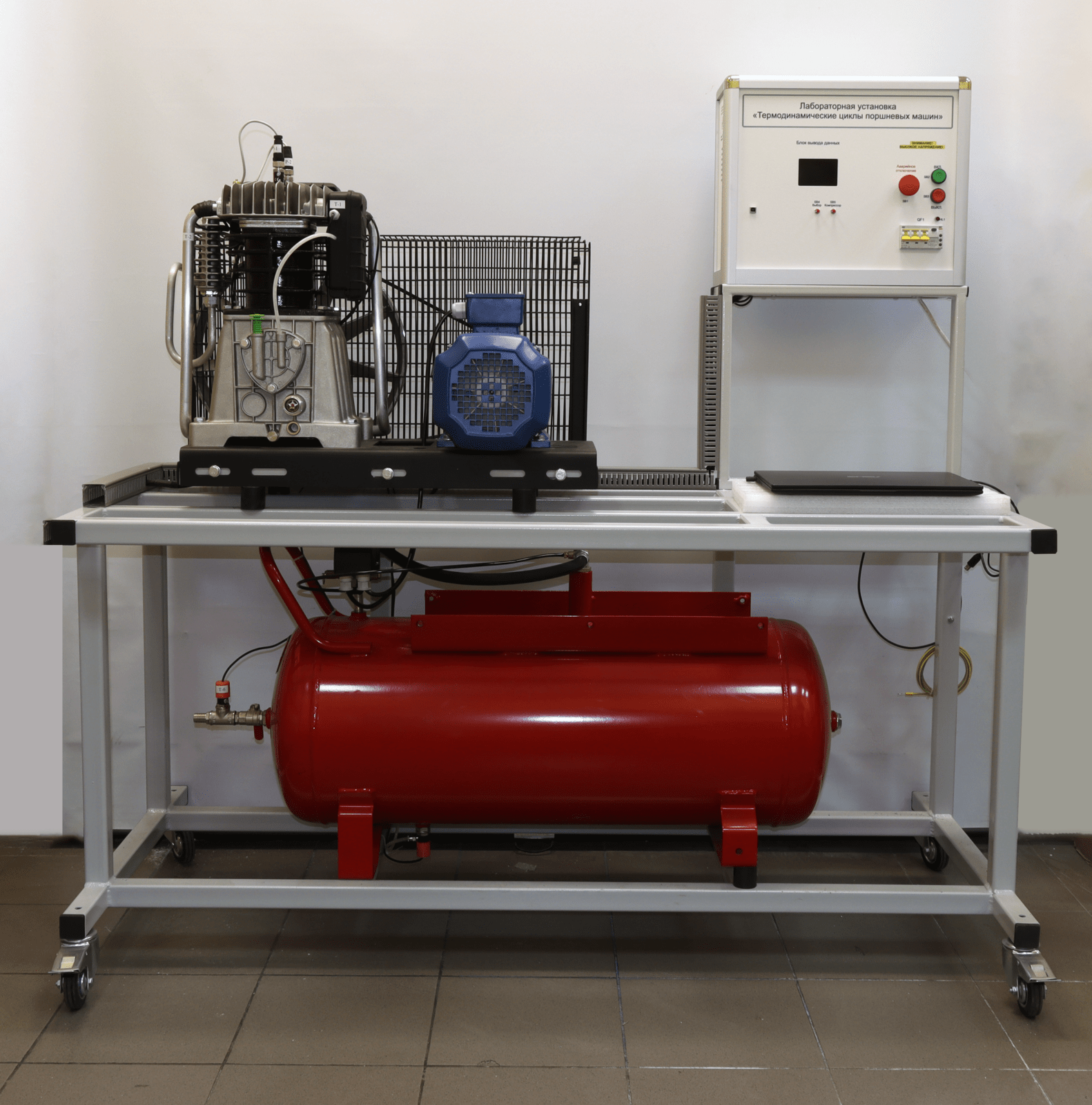 Лабораторный стенд «Термодинамические циклы поршневых машин» обеспечивает проведение лабораторно-практических занятий в учреждениях начального профессионального, среднего профессионального и высшего профессионального образования, по изучению конструкции и принципа работы поршневого компрессора, а также термодинамические процессы в поршневых машинах. Установка выполнена согласно ТУ 32.99.53–001–09519063– 2019 и имеет соответствующий сертификат производителя ГОСТ Р и сертификат качества ИСО 9001-2015 на данный вид продукции.