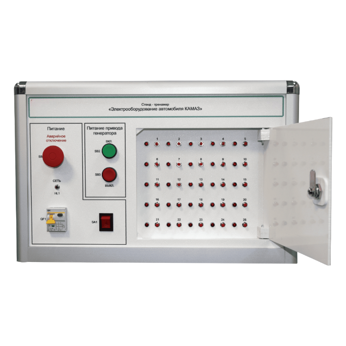 На панели управления размещён блок ввода неисправностей, позволяющий имитировать 25 неисправностей электрооборудования автомобиля КамАЗ.