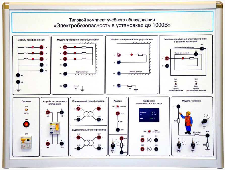 Модели трех электропотребителей, два из которых подключены через автоматические выключатели с защитой от сверхтоков и один через устройство защитного отключения, реагирующего на дифференциальный ток предназначены для имитации работы различных потребителей электроэнергии.