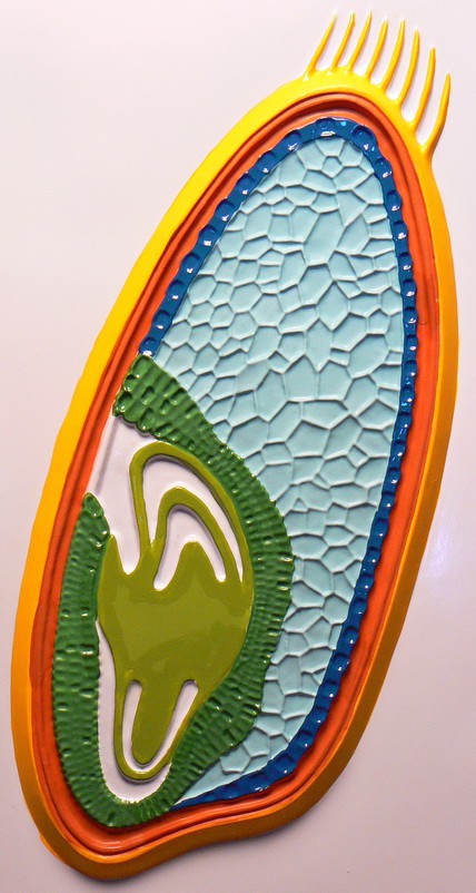 Модель изготовлена из пластмассы путём вакуумного формования. На модели рельефом и цветом показаны следующие детали строения семени: